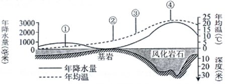 小题1:根据图中岩石的风化深度与年均温和年降水量的变化情况,岩石的风化深度与年降水量大致呈正相关关系,由②地均温与岩石的风化深度的关系,可推出岩石的风化深度与年均温不是正相关也不是负相关。
