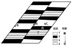 仅考虑地壳运动对岩层的影响,则同为砂岩的乙、戊、丁,其岩层坚硬程度从大到小排序是