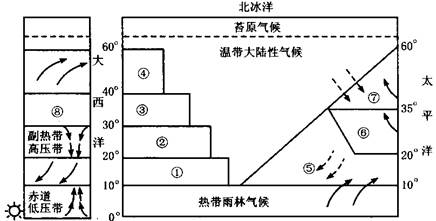 4、综合题 如图为气候类型分布模式图,图中左侧是某季节影响气候形成的气压带风带位置示意图。据此回答问题。(每空2分,共14分)