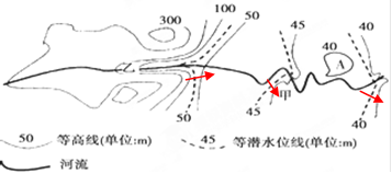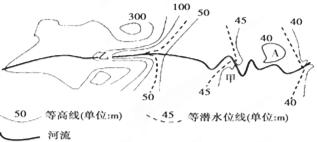 小题1:从下图中可见地下水与河水的关系,河流在甲及下游地区河流补给地下水为地上河,该河容易发生洪涝灾害,A地区比周围海拔低,可以形成蓄洪区以减少丰水期河流压力,C对。