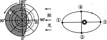 3、综合题 读“极点太阳照射投影图”和“地球公转轨道示意图”完成下列问题。