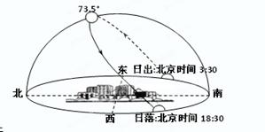 3、单选题  读某地大阳一天的视运动图,该地一年中最大的正午太阳高度为73.5°。读图回答问题。