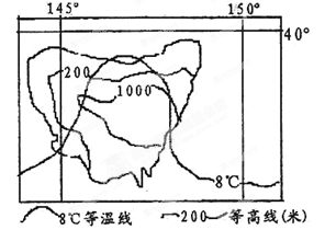 1.读图,40°纬线附近有8°C等温线经过,说明此时是冬季,气温较低。根据图中等高线可以判断,陆地上是山地地形,图中的等温线经过山地时,等温线应向低纬方向凸出,所以根据弯曲方向,可以判断图示区位于南半球的西风带,图示区属于温带海洋性气候。所以气候特点是冬温夏凉,四季湿润,C对。A描述的是热带沙漠气候,从纬度看岛屿属于温带,A错。岛屿西部是迎风坡,降水多,东部是背风坡,降水少,B错。从图中等高线可知,岛屿主要是山地,D错。