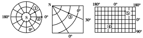 【小题1】仔细读图,第一幅图为南极上空的俯视图,图中①的坐标为(30°S,30°W),②的坐标为(0°,0°);第二幅图上,③的坐标为(30°E,30°N);第三幅图为矩形图,④点的坐标为(30°S,30°W),⑤的坐标为(60°N,90°E)。因此答案选B。
