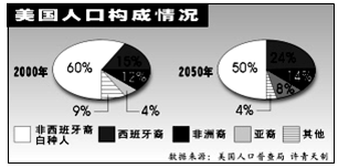 3、单选题 美国人口普查局近日宣布,在东部时间2006年10月17日早晨7点46分,美国人口总数将突破三亿大关,这是美国人口史上具有里程碑意义的一刻。读美国人口结构情况图,回答以下各题。