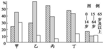 5、单选题 读甲、乙、丙、丁四个国家2011年0~14岁、15~64岁、65岁及以上三个年龄段的人口比例示意图,完成以下问题。