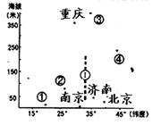 2、单选题 右图给出我国一些主要城市的纬度与海拔高度,读图完成1—2题。