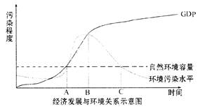 ⑴图中所示经济发展水平与环境污染程度都较低的时段是______;A~B时段经济发展与环境的关系是______;B—C时段二者的关系是______。(3分)