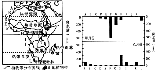 3、综合题 下面左图是“非洲大陆植物类型分布示意图”,右图上下两部分是“非洲西部沿海A—L各地一月份和七月份降水量示意图”。读图,完成下列要求。(22分)