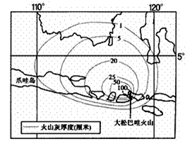 本题解析:1.本题考查地理图表的判读能力。图示地区位于东南亚地区,地形乙山地丘陵为主,平原面积小,所以耕地资源缺乏;根据火山灰的蔓延方向判断,该地吹偏南风;火山灰能够带来肥沃的土壤,所以当地人口密度与火山灰厚度成正比;该地为热带雨林气候。所以本题选择C选项。