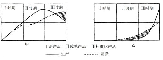 B.在Ⅱ时期,甲地区生产量小于消费量