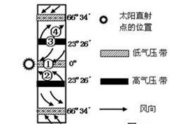 1.图中表示信风带的代号是:2.影响地中海气候形成的气压带和风带是:3.气压带和风带位于图示位置时,以下说法正确的是: