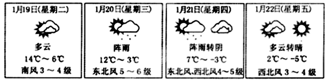 4、单选题 下图是由中央气象局发布的某城市2011年1月19日—22日的天气预报。读图,回答下面问题。
