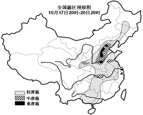4、单选题 霾是大量极细微的干尘粒等均匀地浮游在空中,使水平能见度小于10千米的空气出现混浊现象。气温越低,空气中所能容纳的水汽就越少,越容易形成霾。十一长假过后,全国多地再遭"霾伏。读图回答问题。