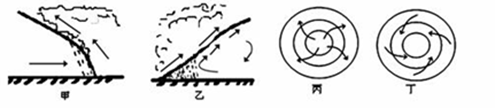 【小题2】大风、降水天气,有助于灰霾天气的扩散;图示甲是冷锋,是由北向南推进的,不符题意;乙是暖锋,由南向北推时的,使我国雾霾天气从南到北开始消散,符合题意;丙是反气旋,盛行下沉气流,天气稳定,丁是气旋,盛行上升气流,有降水出现,但气旋和反气旋天气不能由南向北推时,不符合题意。选B正确。