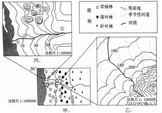 (1)与甲图相比,乙图的比例尺?(大或小)、图示区域范围?(大或小)、图示内容______(详细或简略)。(6分)