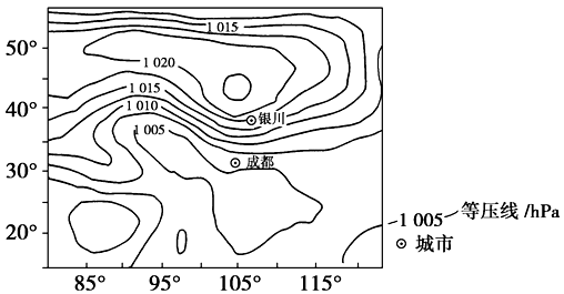 (2)气温高低:纬度——太阳辐射,洋流——寒暖流,海陆分布——海陆热力差异,地形——地势高低,人——植被破坏和城市热岛。结合题意,银川纬度高,海拔高,接近冷气团源地;成都纬度低,位于盆地,且城市热岛效应明显。