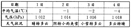 3、单选题  下表是某城市1月1~4日的天气状况资料,据此判断这段时间影响该城市的天气系统是
