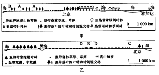 5、单选题 下列两幅图中,甲图为从雅加达到北京附近沿经线的植被分布示意图,乙图为经北京附近沿纬线的植被分布示意图。读图回答1~2题。