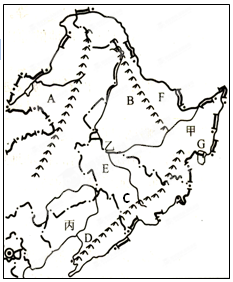 (1)山脉A、B、C,河流D、E、F、G,平原甲、乙、丙中,长白山地是______(填代号,下同),黑龙江是______,乌苏里江是________,松嫩平原是_______。(4分)