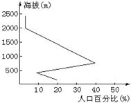 本题解析:据图可直接读出500~1000米海拔高度范围内人口占总人口百分比比重最高,由此可想到热带地区受气候条件影响人口多分布在相对凉爽的高原,而不是集中分布在200米以下的平原地区。