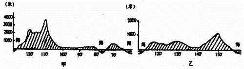 5、单选题 下面甲、乙两图为两个国家的地形剖面图,甲图剖面线为55°N,乙图剖面线为23.5°S,下列关于两国的正确叙述是