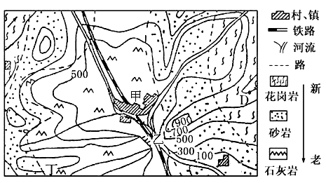 (4)建大坝要看大坝所在地是否地质稳定,是否有峡谷地带,还要看水库蓄水后对当地影响是否大。从图中可以看出:大坝选址所在地多为石灰岩,容易造成漏水。而且水库蓄水后甲村会淹没,这样人口迁移量大,还会淹没铁路造成巨大经济损失,故不同意。