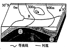 5、单选题 下图为30°N附近沿海某地等高线地形图和地层示意图,R河流正值汛期,读图回答问题。