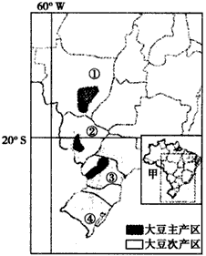 1、单选题 读甲国大豆产区在该国各州的分布示意图,完成1—2题。
