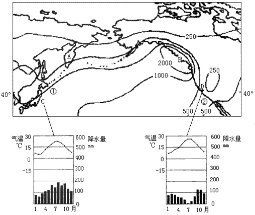 (2)比较图中C、D两地气候特征的差异,分析其形成原因。