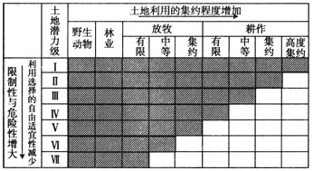 注:1斜线部分为相应潜力级所适合宜的利用范围 2:农业集约化是指在一定面积的土地上投入较多的劳动、资金和技术,以期取得较多的单位面积产量,叉能减少单位产品劳动耗费的一种农业经营方式