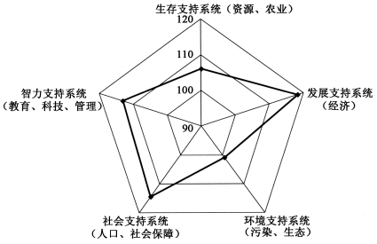 1、多选题 《2013中国可持续发展战略报告》提出可持续发展五大支持系统。报告以1995年全国可持续发展能力指数为100,图表示2010年五大支持系统的能力指数。读图回答问题。
