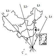 1、单选题 经天文学家精密计算确定:南沙群岛的海马滩(①点)为我国版图2012年第一道阳光地点,1月1日的日出时刻为北京时间6时27分;浙江省温岭市的石塘镇(②点)为我国大陆的第一道阳光地点。读图,回答问题。