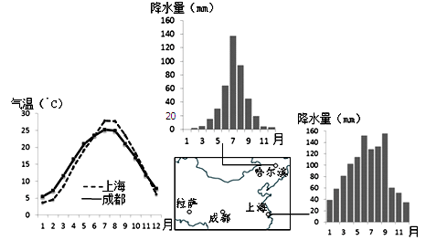 (1)从图中可以看出,秋季时上海的降雨量多雨哈尔滨的降雨量,根据各月降雨量可分别计算出两地秋季降水总量。上海纬度较低,秋季锋面雨带南移,使该地再次形成雨季,降雨多。而北方的哈尔滨,一般7、8月份为雨季,秋季时锋面雨带南移,该地雨季结束。