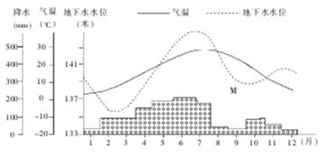 1、单选题  下图是我国某地气温、降水和地下水水位年内变化图,读图,完成下列各题。
