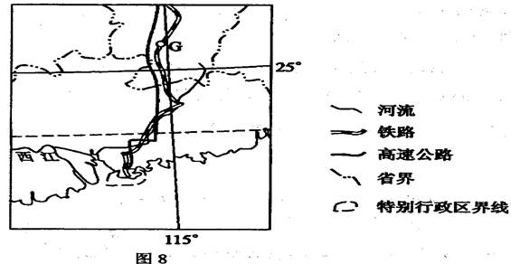 2、综合题 近些年来,G市(图8)大力建设工业开发区,以优惠政策吸引珠江三角洲地区劳动密集型产业的转移。完成下列要求。(10分)