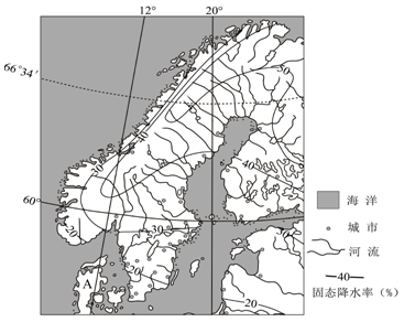 (1)简述斯堪的纳维亚半岛固态降水率的分布特点。(6分)
