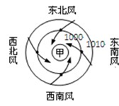 (1)绘出甲地区四个方向(图中四点)处的风向。