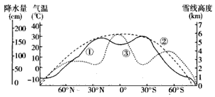 5、综合题 雪线高度是指终年积雪下限的海拔。下图表示全球不同纬度多年平均雪线高度、气温、降水量的分布。读图回答(1)~(3)题。