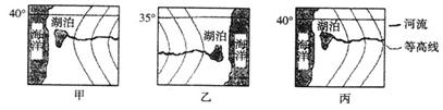 小题1:甲河流流向是自西向东,北岸侵蚀是向左偏,在南半球;乙流向是自东向西,北岸侵蚀是向右偏,在北半球,位于大陆的东岸,所以亚热带季风气候;丙流向自东向西,北岸侵蚀,在北半球,位于大陆的西岸是地中海气候。正确的是D项。