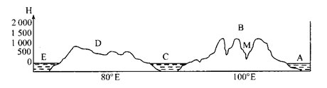 2、综合题 读“沿20°N纬线地形剖面示意图”,回答下列问题。