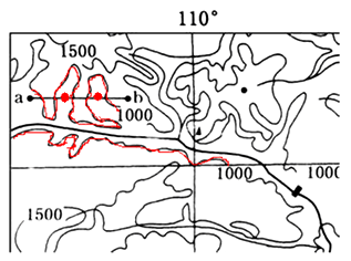 第(3)题,结合等高线分布特点判定C处海拔高度。由于C地海拔H的大小范围为900<H<1 000(米),与②古寺相差高度h的范围为800<h<900(米)之间,由于每相差100米?温度相差0.6℃,故而可知两地温差范围T为4.8<T<5.4(℃)。