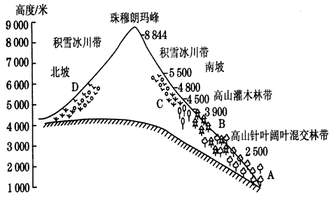 3、综合题  下图是“珠穆朗玛峰地区的自然带分布图”,读图回答下列问题。