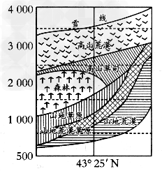 5、单选题 ? 读图①(105°E,26°N),②(128°E,42°N),③(90°E,43°N)3个地点的山地针阔混交林垂直分布示意图,回答1—2题。