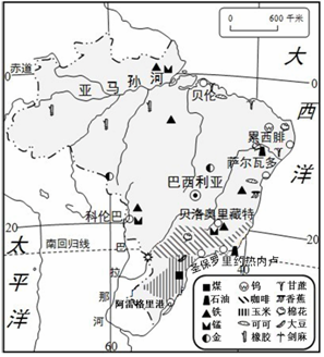 材料二:巴西矿产资源和农产品分布图(下图)。