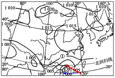 2.此时,受E天气系统影响,海南岛和雷州半岛东部海面受偏南风控制,又因为风是从海洋上吹过来的,带来大量降水,故多阴雨天气。如下图中蓝色虚线为气压梯度力方向,红色实线为方向。
