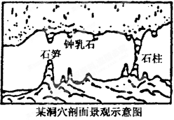 1.图中所示的地形景观多分布在2.该地形景观在我国四大高原中有广泛分布的是3.形成该洞穴中钟乳石、石笋的地质作用是