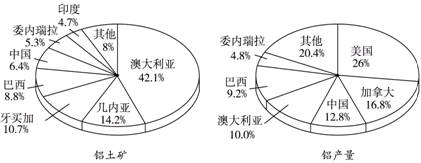 1、单选题 下图是“某年部分国家占世界铝土矿及铝产量的比重图”,完成24~25题。