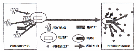 本题解析:本题考查工业区位分布和读图综合分析能力。根据图示铜粗炼厂位于西部铜矿产区判断其属于原料指向型工业;精炼厂位于东部铜材消费区反映了精炼厂属于市场指向型工业。