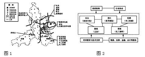 2、综合题 图1为广东省佛山市产业分布示意图,图2为佛山市顺德区家具生产专业镇联系示意图。读图回答问题。(11分)